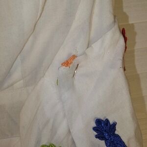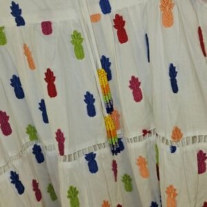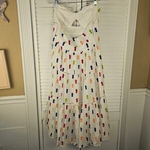 Charming white dress with colorful pattern. Strapless design. Tiered skirt with lace trim.
