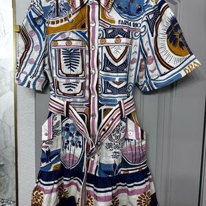 Vibrant dress with geometric and floral patterns. Features a belted waist and button-up front. Short sleeves and collared neckline.