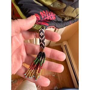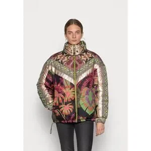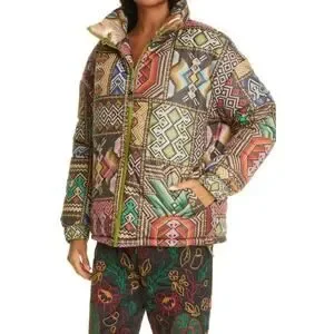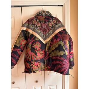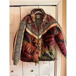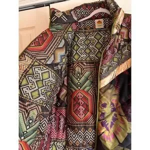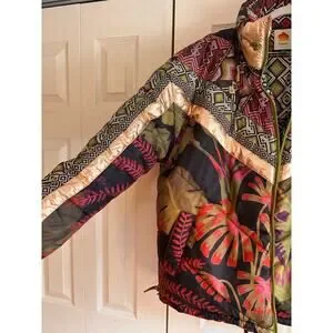 Vibrant jacket with geometric and leaf patterns. Features a mix of colors for a bold look. Perfect for adding flair to any outfit.