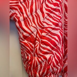 Vibrant jacket with bold patterns. Features a mix of colors. Stylish and eye-catching design.