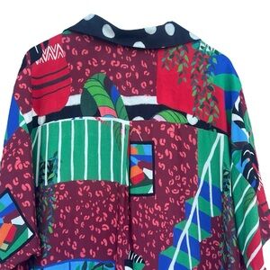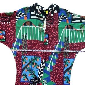 Vibrant jumpsuit with bold patterns. Features a mix of red, green, blue, and orange. Relaxed fit with a stylish design.