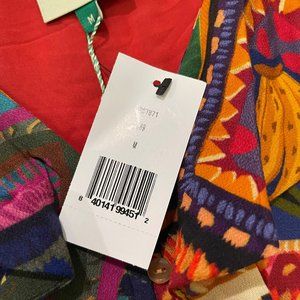 Vibrant midi dress with a bold multicolor pattern. Features long sleeves and a flowing silhouette. Perfect for a statement look.