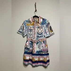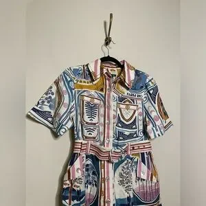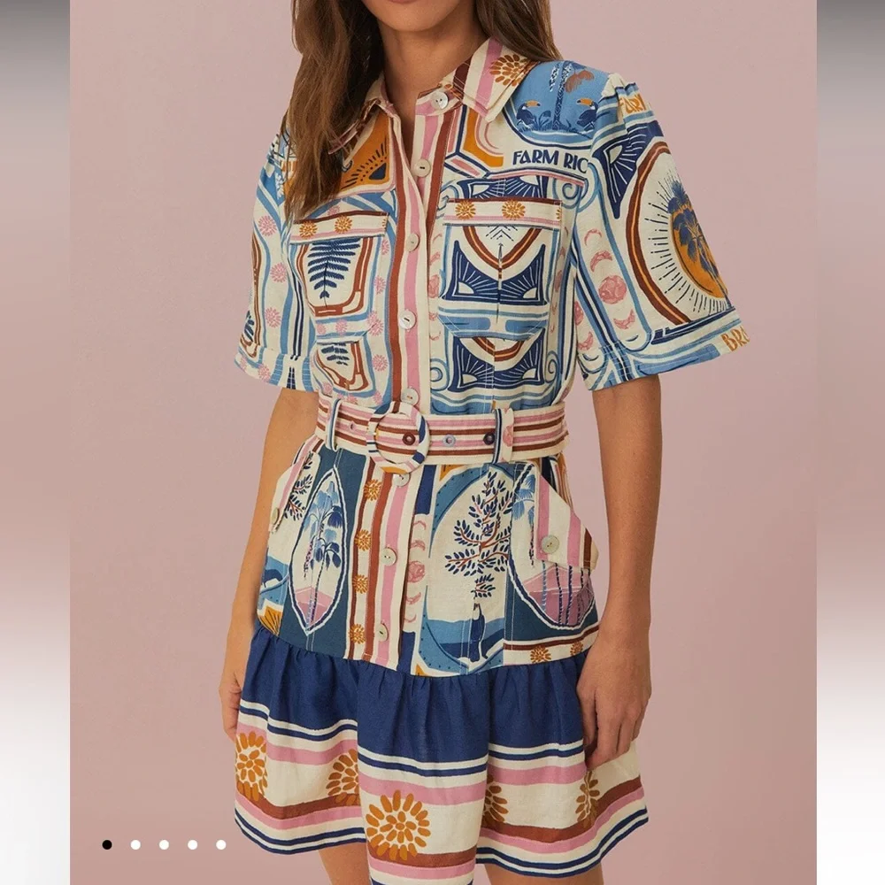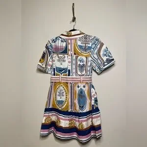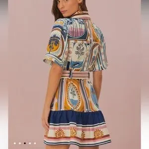 Vibrant mini dress with a bold pattern. Features a belted waist and short sleeves. Perfect for a stylish look.