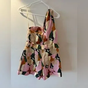 Chic romper with a vibrant multicolor pattern and belt. Features a stylish design with a mix of pink, orange, and green tones. Brand new with tags on.