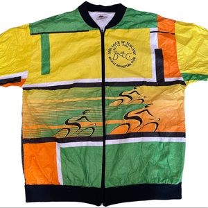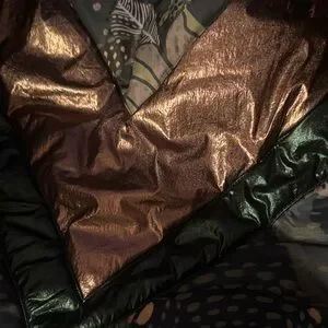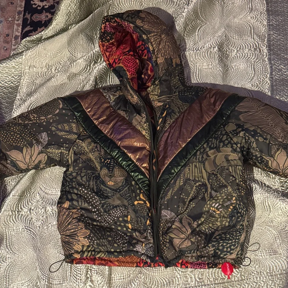 Vibrant puffer jacket with intricate patterns. Features a mix of earthy tones. Hooded design with a front zipper.