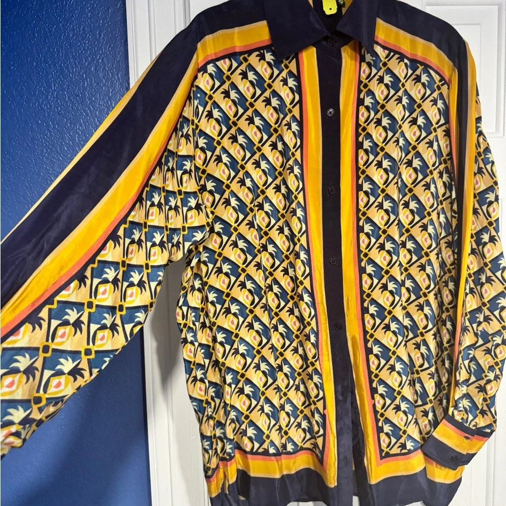 Bold shirt with intricate patterns. Features a mix of yellow, blue, and red hues.