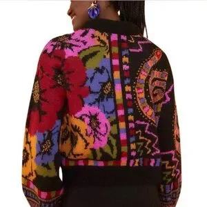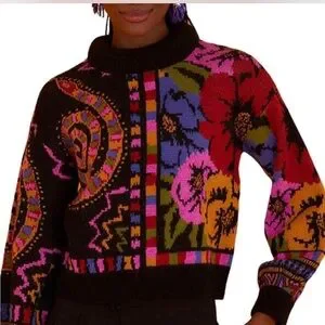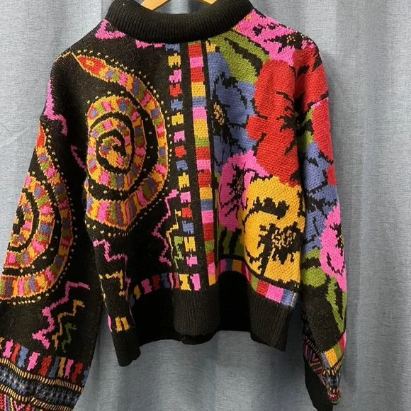 Vibrant sweater with bold patterns. Features a mix of colors for a striking look. Perfect for adding flair to any outfit.- EUC