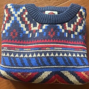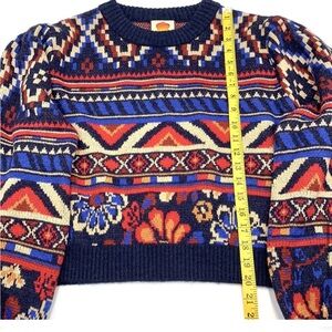 Vibrant sweater with intricate patterns. Features a mix of colors. Cozy and stylish design.