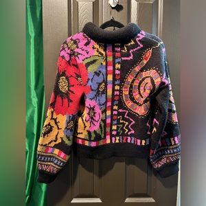 Vibrant sweater with bold patterns. Features a mix of colors including pink, purple, and green. Cozy and stylish design.