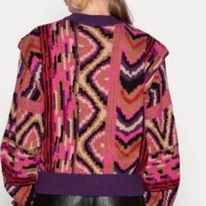 Vibrant crew neck sweater. Features bold geometric patterns. Perfect for a stylish look.
