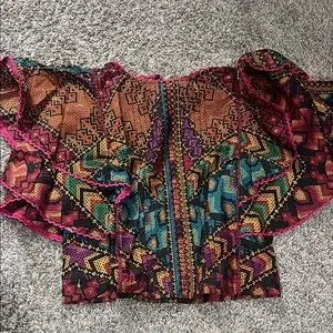 Vibrant patterned top with intricate designs. Features a mix of colors for a bold look. Perfect for adding flair to any outfit.
