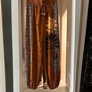 Vibrant track pants with a bold pattern. Features drawstring waist. Perfect for casual wear.