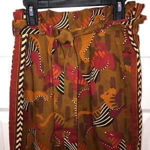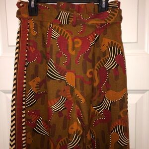 Vibrant patterned trousers. Features a mix of red, brown, and white. Stylish and bold design.