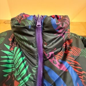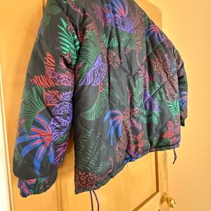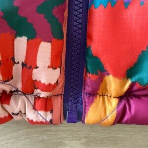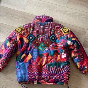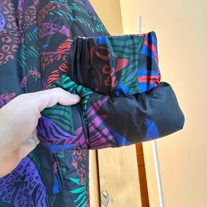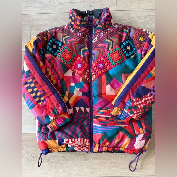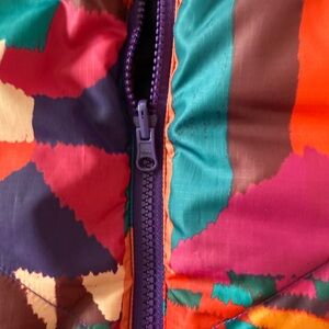 Vibrant reversible puffer jacket with geometric and floral patterns. Features a mix of bold colors. Perfect for a statement look.