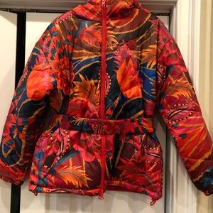Puffer jacket with vibrant multicolor design. Features bold patterns and a stylish look.