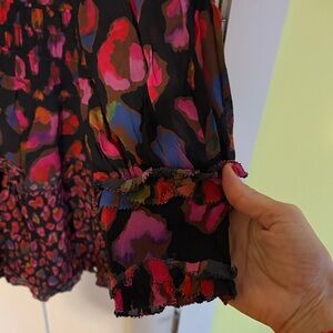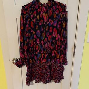 Chic casual dress with vibrant pattern. Features ruffled collar and cuffs. Perfect for a stylish look.