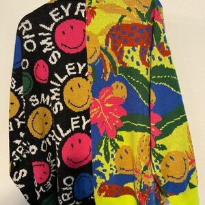 Vibrant cardigan with smiley face design. Features a mix of colors for a playful look. Perfect for adding fun to any outfit.