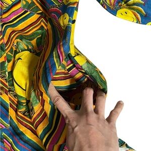 Vibrant shirt with smiley face design. Features geometric patterns. Button-up style. Perfect for a bold look.