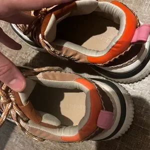 Stylish sneakers with a mix of brown, tan, and green. Comfortable and trendy design. Perfect for casual wear.