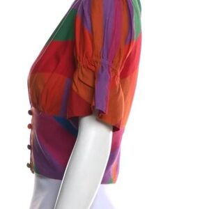 Chic blouse with vibrant stripes. Features deep V-neck and button detail. Perfect for a bold look.