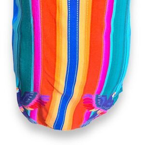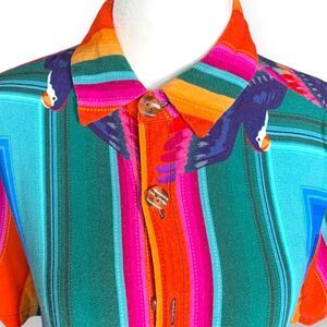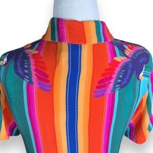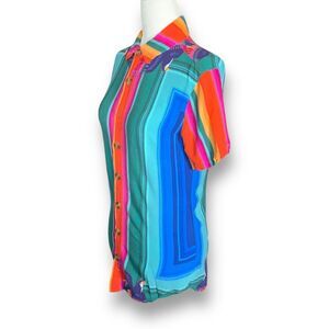 Vibrant button down shirt with bold stripes. Features short sleeves and button closure. Perfect for a colorful statement.