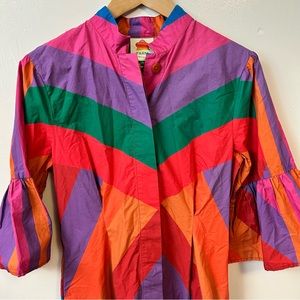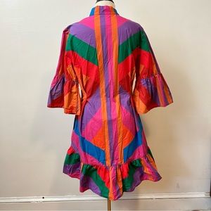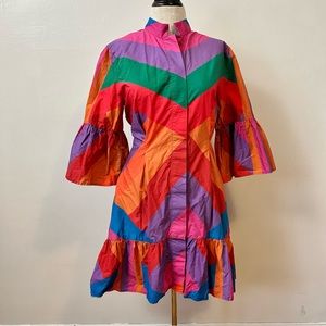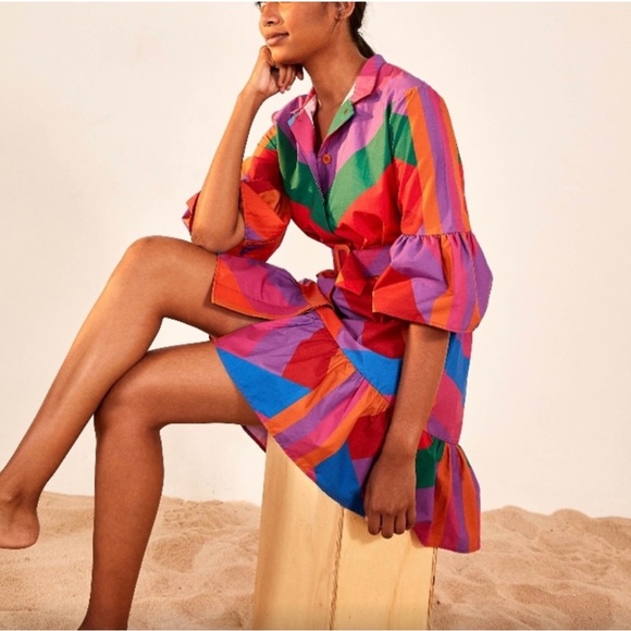 Vibrant dress with bold stripes. Features puff sleeves and button-up front. Perfect for a lively look.