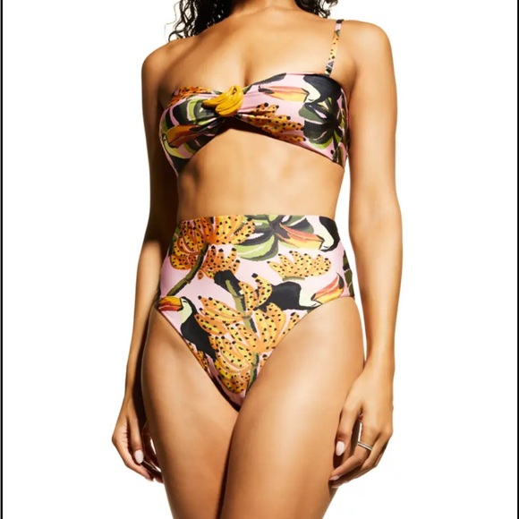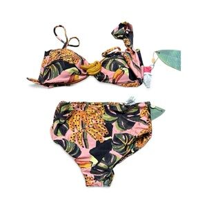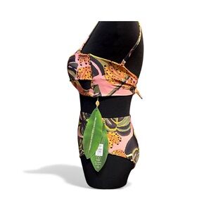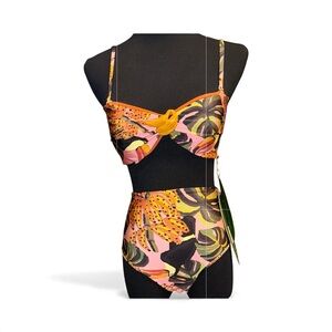 Vibrant bikini with tropical leaf print. Features pink, orange, and green hues. Stylish and bold design.