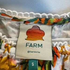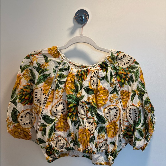 Vibrant tropical print blouse. Features bold fruit and leaf design. Elastic neckline and hem. Perfect for a sunny day.