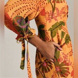 Vibrant tropical print. Three quarter length sleeves with tie cuffs. Soft neckline square neckline with a puckered bust. Relaxed fit. Worn once for a destination wedding. In great condition!