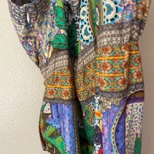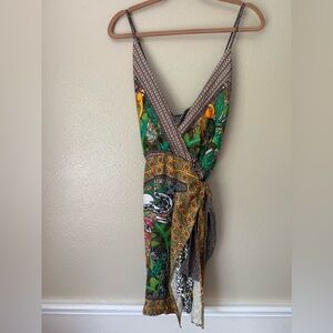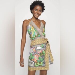 Vibrant mini dress with tropical bird and leaf patterns. Halter neck design. Perfect for summer outings.