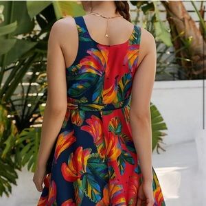 Vibrant wrap dress with tropical leaf print. Features a mix of red, blue, green, and orange hues. Perfect for a bold, stylish look.