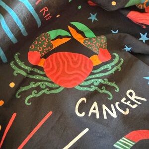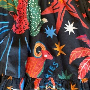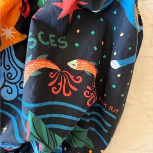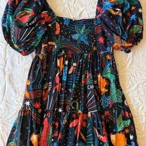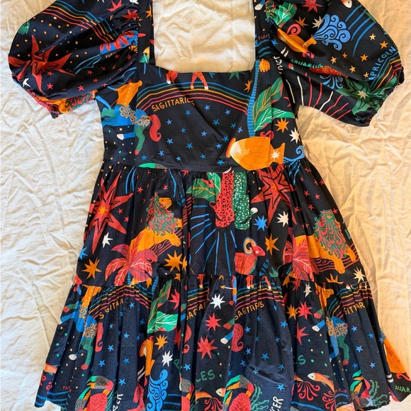 Vibrant mini dress with zodiac print. Features puff sleeves and square neckline. Perfect for a bold look.