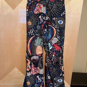 Bold wide leg pants with vibrant graphic design. Features tropical and abstract patterns. Perfect for a standout look.