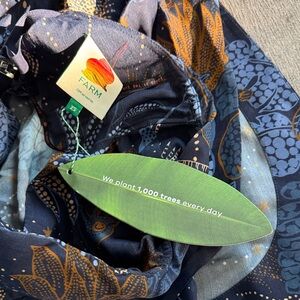 Bold botanical print on a strapless silhouette. Smooth, draped fabric with rich navy base. Features rust and various blue accents. Easy, chic piece for warm-weather styling.