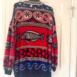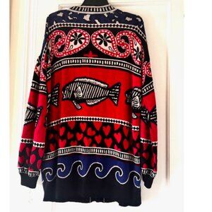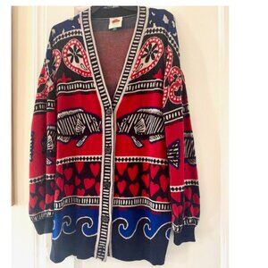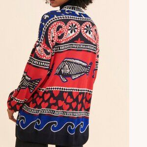 FARM Rio Navy Mixed Prints Fish Paisley Hearts Waves Knit Cardigan Nautical