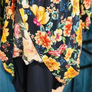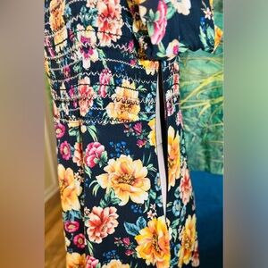 Smocked bodice with elastic stretch. Ruffled neckline trim. Colorful floral print on a navy base. Bright yellow, pink and green accents.