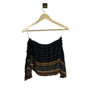 TAGS: farm rio, designer, blouse, patterned, tribal, aztec, bohemian, boho, flowy, maximalist, festival, coachella, cropped, off shoulder, bell sleeve