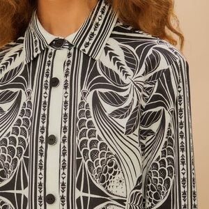 Stylish black and white patterned top. Button-up front. Long sleeves. Elegant design by FARM Rio.