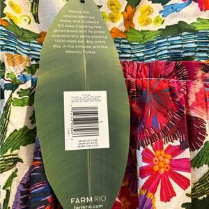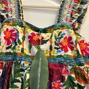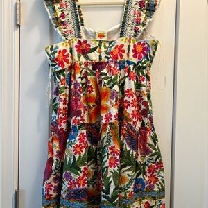 Embrace the vibrant spirit of resort wear with this FARM Rio sundress, featuring a playful mix of orange and red hues. The dress showcases a ruffled, tiered design with flutter cap sleeves and a square neckline, perfect for casual outings. Its flowing silhouette and artistic print make it a standout piece for any sunny day adventure.