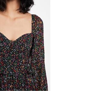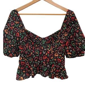 This stylish crop top from FARM Rio features a vibrant orange and black color palette with elegant puff sleeves and a flattering peplum silhouette. The bustier-style design adds a touch of sophistication, making it perfect for both casual and dressy occasions.