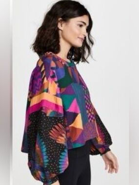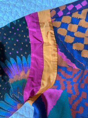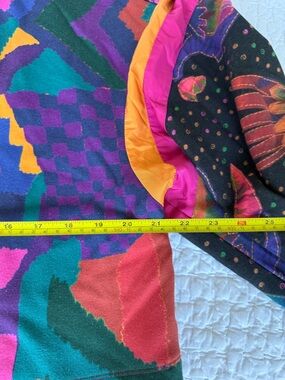 Eye-catching multicolor cropped sweater with an abstract patchwork print. Lightweight fleece/ sweatshirt with a relaxed fit with blouse sleeve detail. Bold pink, purple, teal, orange and black accents create a vibrant look. Easy to style with jeans or skirts for a standout outfit or throw over yoga clothes for a cute cool down style. Like new! 61% polyester/36% cotton/3% elastane
