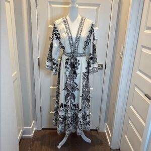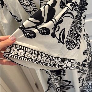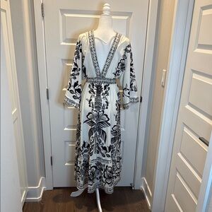 Classic elegance meets tropical flair in this stunning Farm Rio black and white maxi dress. Featuring a bold floral print, wide kimono sleeves, and a flattering v-neckline, this dress is both timeless and statement-making.