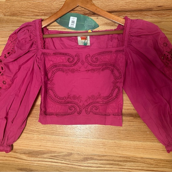 Vibrant pink crop top with intricate embroidery. Features puff sleeves and square neckline. Perfect for a stylish look.