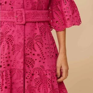 Chic pink midi dress with eyelet design. Features a belted waist and flared sleeves. Perfect for stylish occasions.