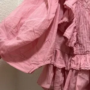 Chic pink blouse with ruffled design. Features lace accents and a deep V-neck. Perfect for stylish outings.