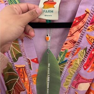 Bright and bold FARM Rio romper with a purple base. Features vibrant multicolor patterns.