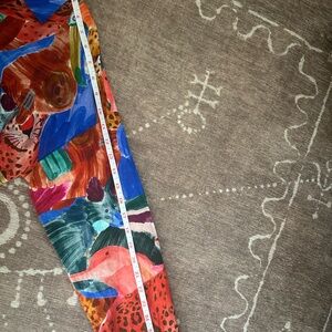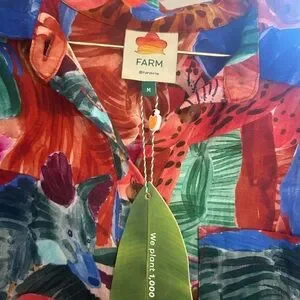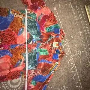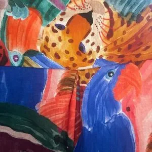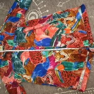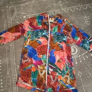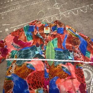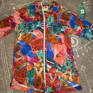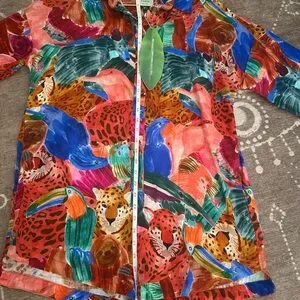Bold multicolor design with animal motifs. Button-down style. Perfect for a vibrant look.