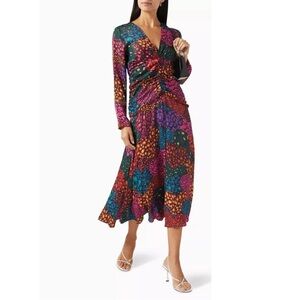 Long sleeves, midi length, v neck, ruched bodice, rainbow leopard print, jewel tones, zipper on back, boho bohemian designer Nordstroms nwt