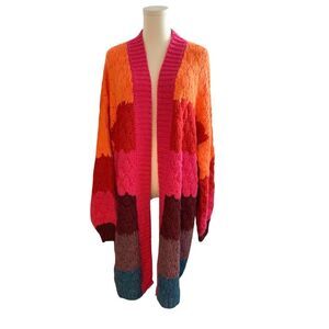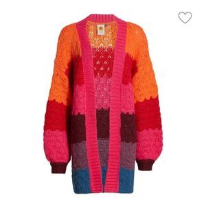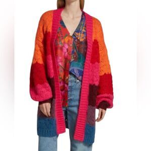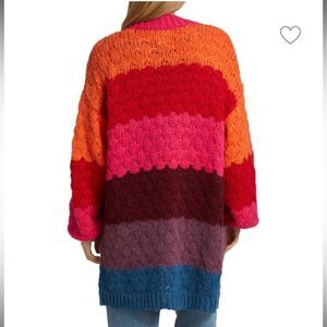 Comfort meets color in this vibrant rainbow stripe-pattern cardigan. Chunky open knit. Drop Shoulders. Open Front. Acrylic/Wool Blend. Machine Wash. Oversized fit. Oversized balloon long sleeves. Approximately 38" inches long and 27" pit to pit. Bold knit sweater by FARM Rio. Features vibrant hues for a standout look. Great condition, no stains, some piling.