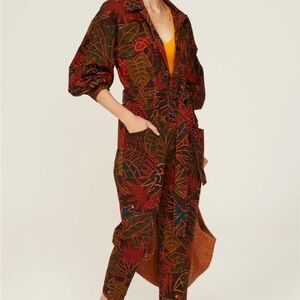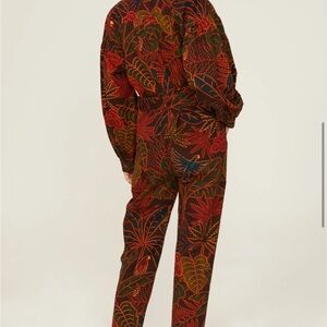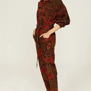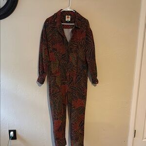 Stylish jumpsuit featuring a vibrant red and green floral pattern. Perfect for a bold fashion statement.